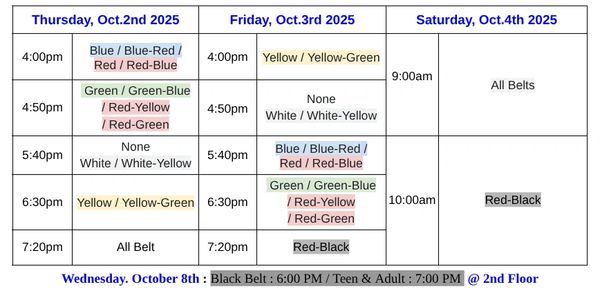 The Olympic Taekwondo Academy Belt Promotion Testing will be held on Thursday - Saturday October 2nd - 4th, 2025.